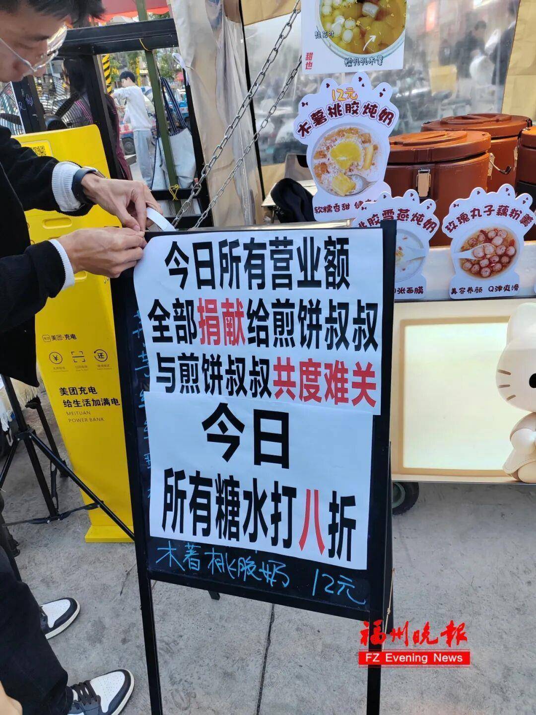 据媒体报道,12月10日傍晚,福建师范大学旗山校区旁边的小吃街上,很多摊位不约而同地更换了同一个收款码开始义卖。原来,小吃街上的武夷特色煎饼摊主张建武被确诊为癌症,需要高昂的治疗费用。他的家人在网上发起求助后,当地大学生纷纷转发消息。其他摊主得知此事,也主动伸出援手,并在自家摊位贴出通知:“今日所有营业额,全部捐给煎饼叔叔。”